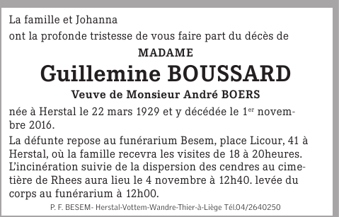 Décédée à Herstal (4040) le mardi 1 novembre 2016 à l'âge de 87 ans