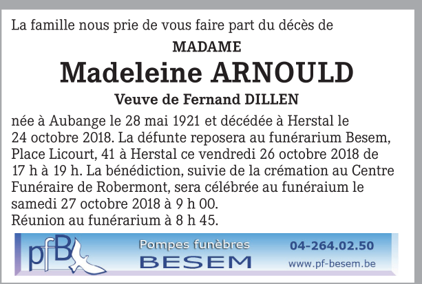Décédée à Herstal (4040) le mercredi 24 octobre 2018 à l'âge de 97 ans