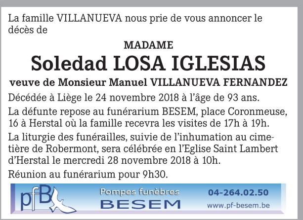 Décédée à Liège (4000) le samedi 24 novembre 2018 à l'âge de 93 ans