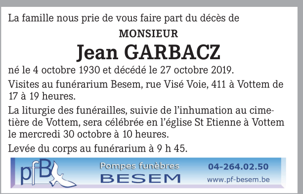 Décédé à Vottem (4041) le dimanche 27 octobre 2019 à l'âge de 89 ans