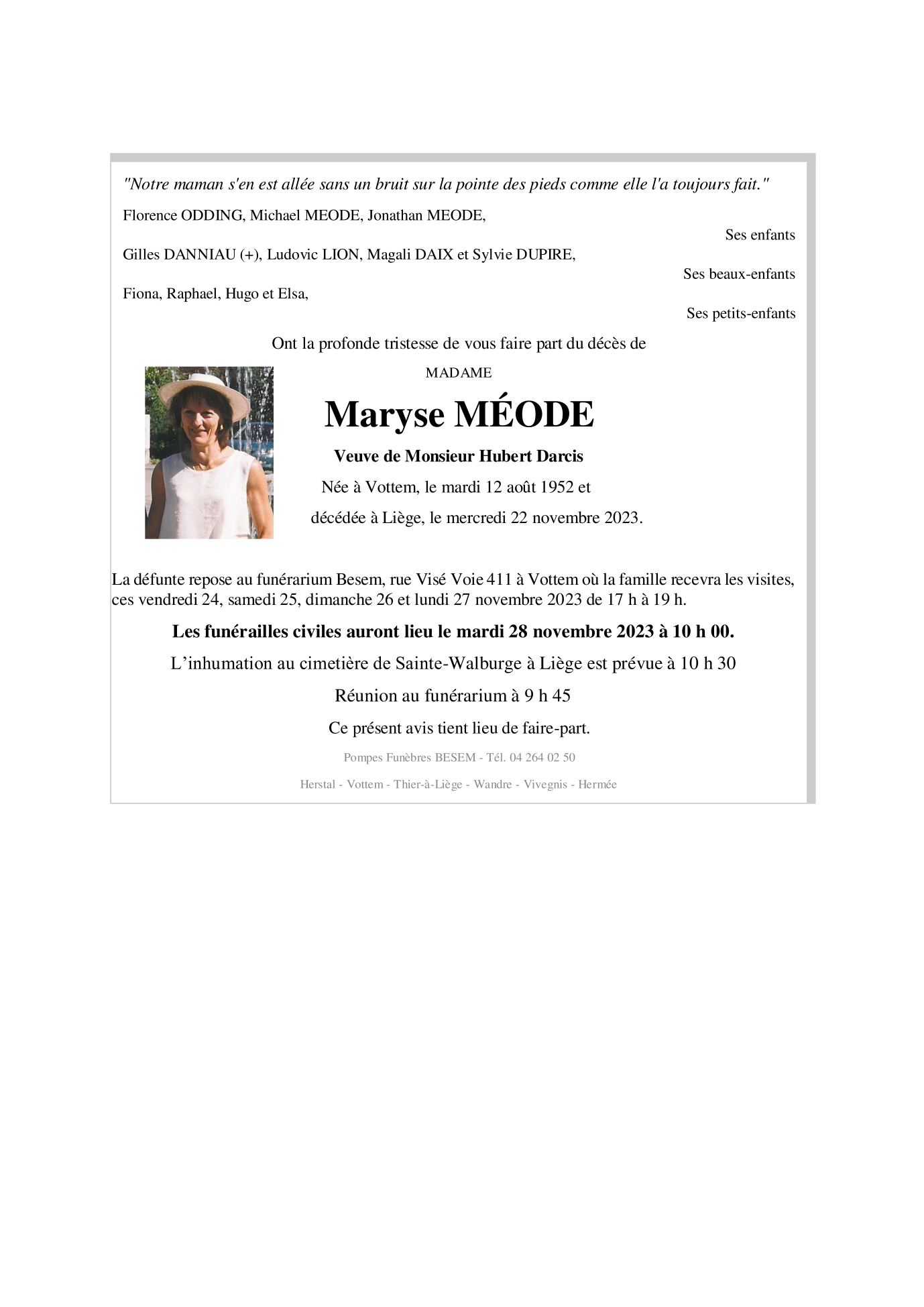 Décédée à Liège (4000) le mercredi 22 novembre 2023 à l'âge de 71 ans