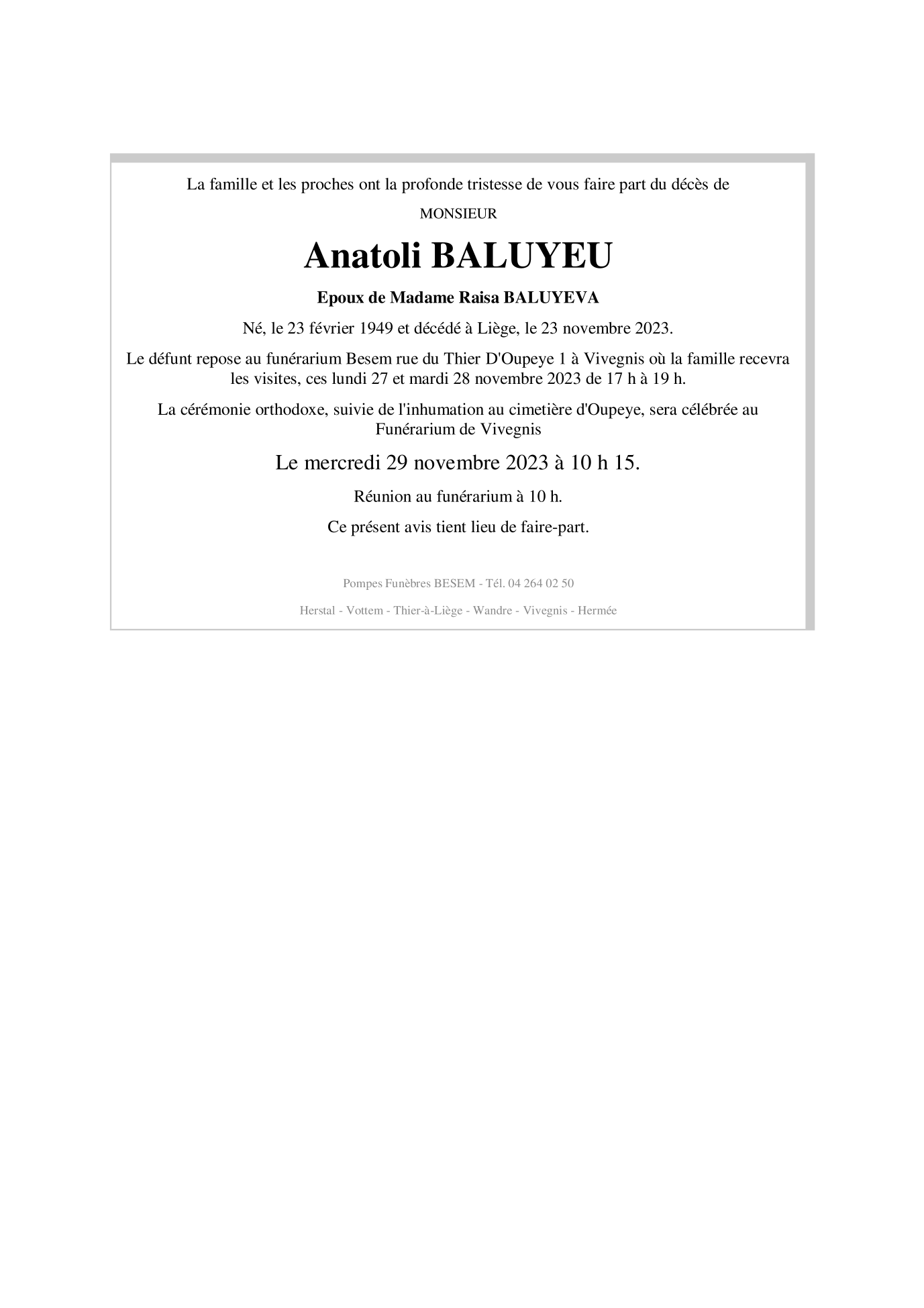 Décédé à Liège (4000) le jeudi 23 novembre 2023 à l'âge de 74 ans