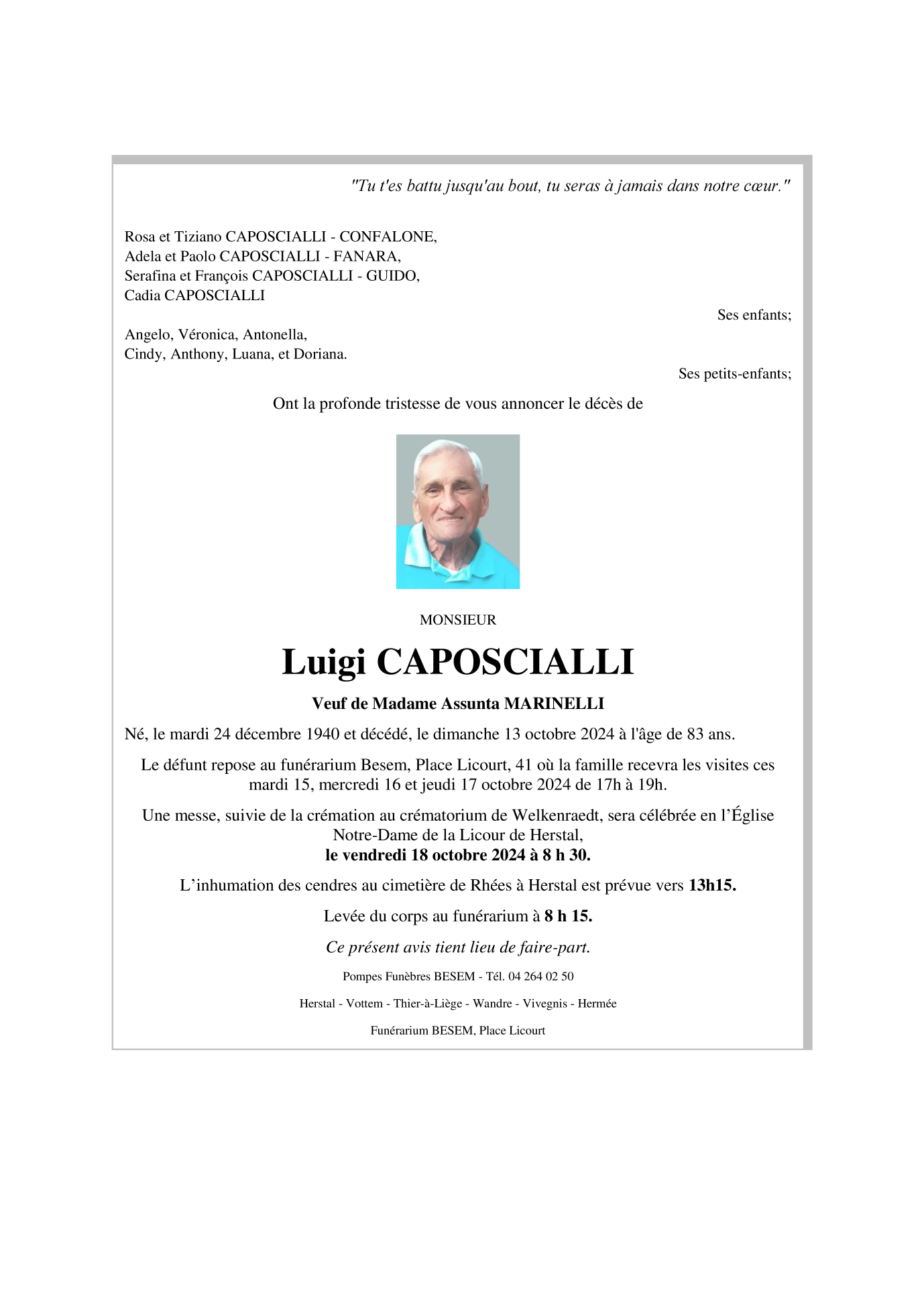 Décédé à Herstal (4040) le dimanche 13 octobre 2024 à l'âge de 83 ans