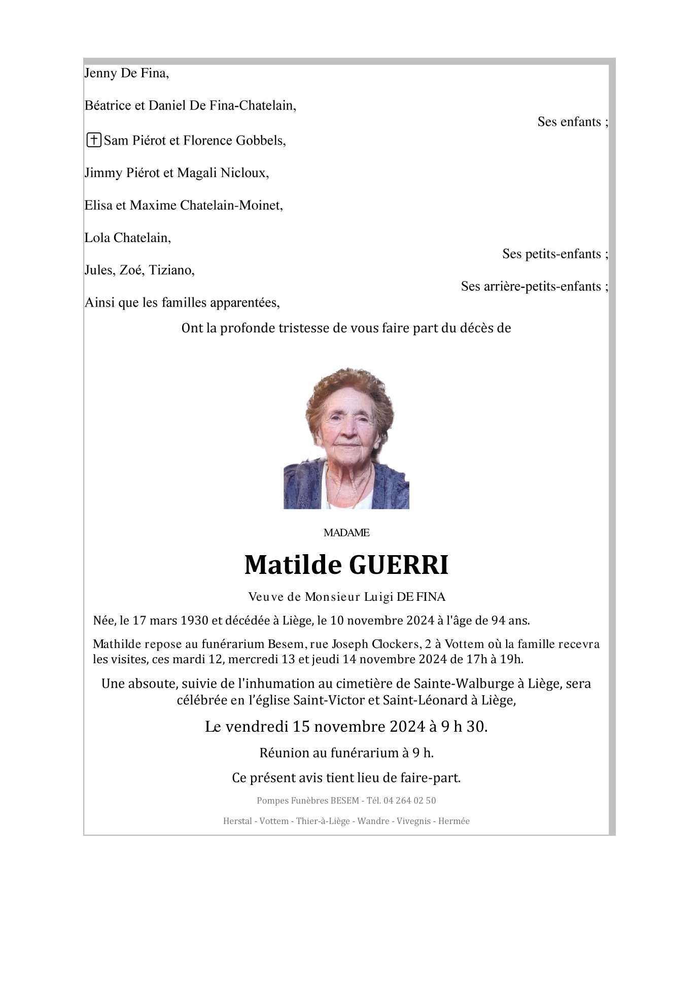 Décédée à Liège (4000) le dimanche 10 novembre 2024 à l'âge de 94 ans