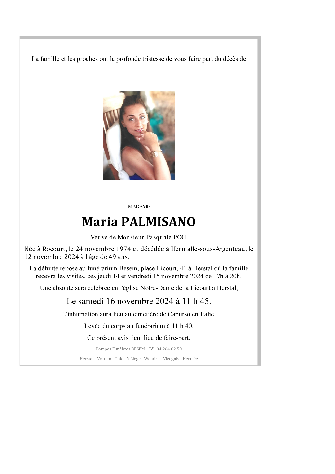 Décédée à Hermalle-sous-Argenteau (4681) le mardi 12 novembre 2024 à l'âge de 49 ans