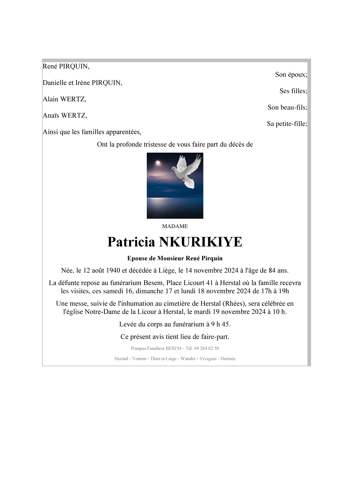 Décédée à Liège (4000) le jeudi 14 novembre 2024 à l'âge de 84 ans