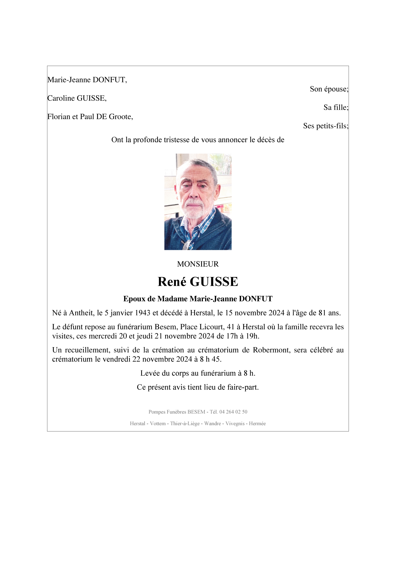 Décédé à Herstal (4040) le vendredi 15 novembre 2024 à l'âge de 81 ans