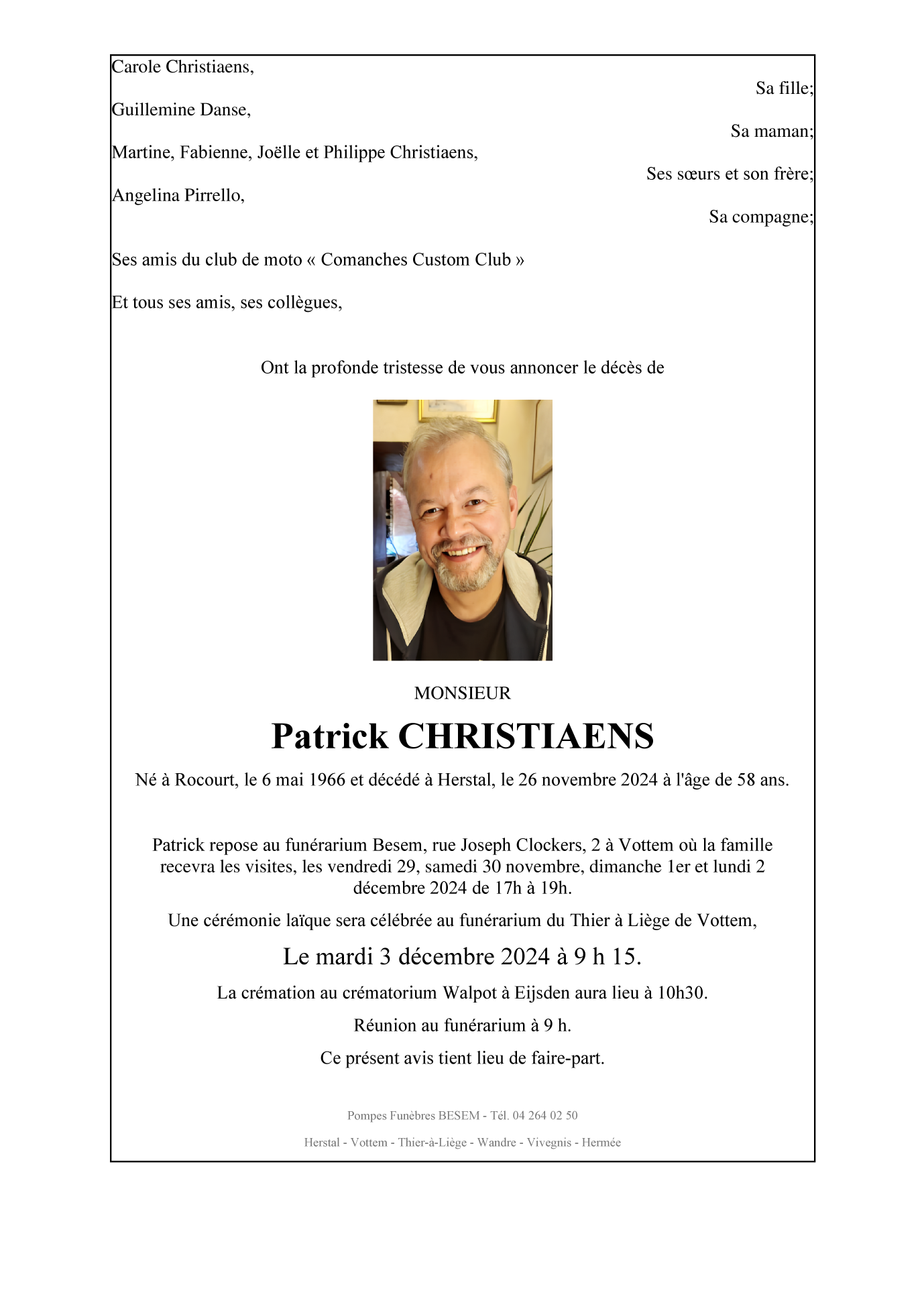 Décédé à Herstal (4040) le mardi 26 novembre 2024 à l'âge de 58 ans