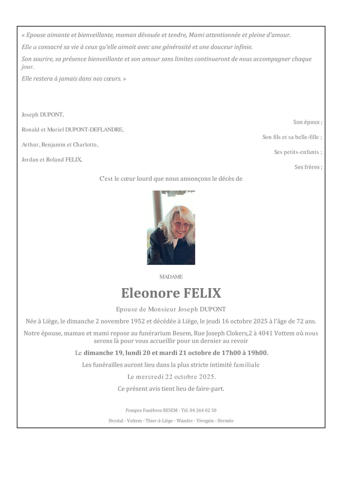 Décédée à Liège (4000) le jeudi 16 octobre 2025 à l'âge de 72 ans