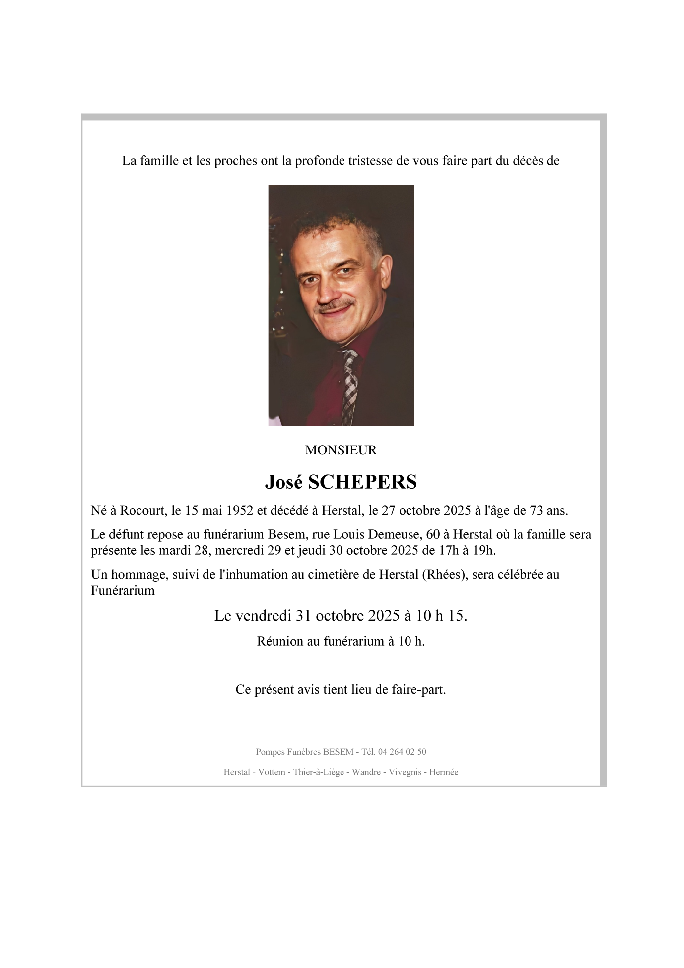 Décédé à Herstal (4040) le lundi 27 octobre 2025 à l'âge de 73 ans