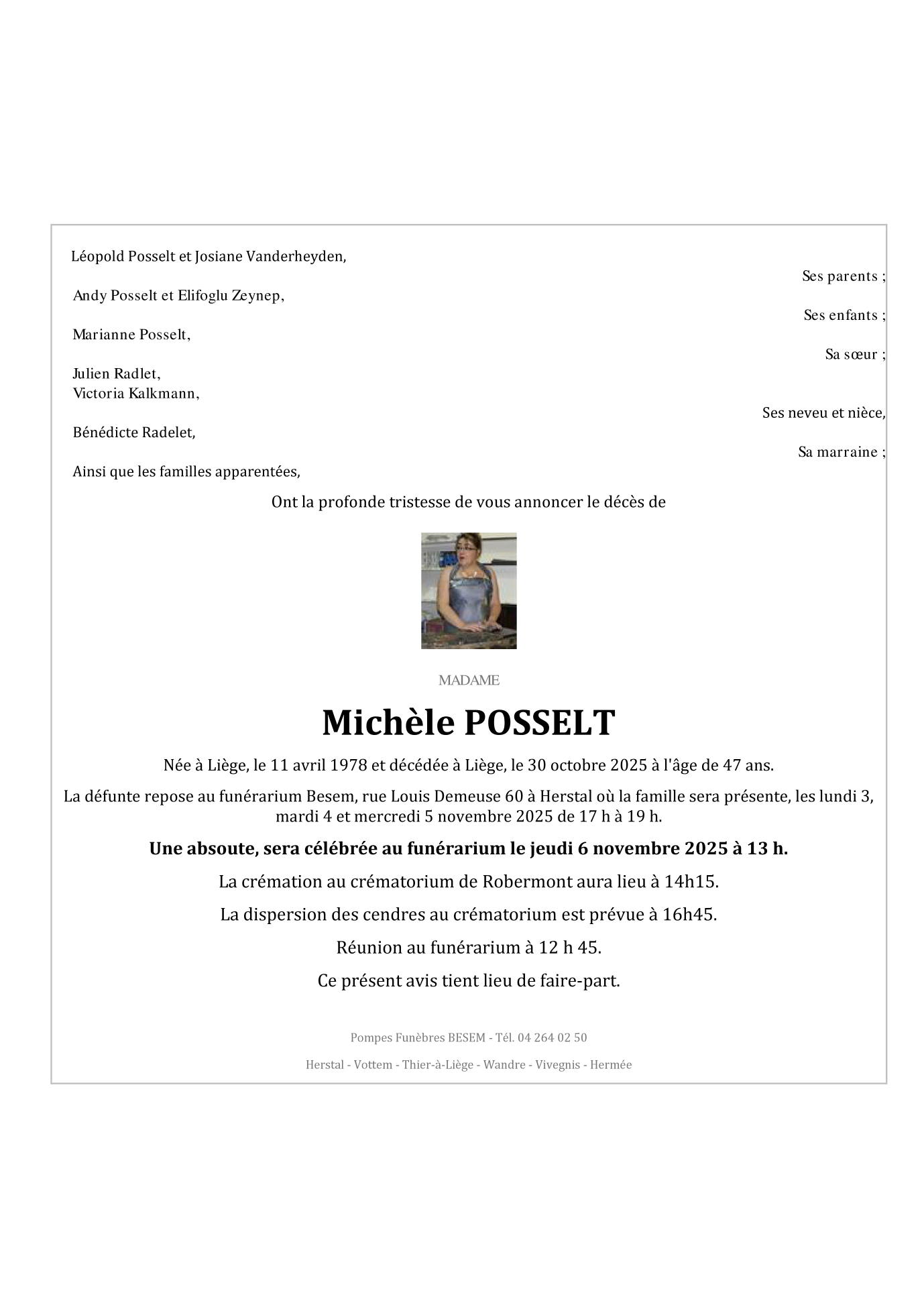 Décédée à Liège (4000) le jeudi 30 octobre 2025 à l'âge de 47 ans