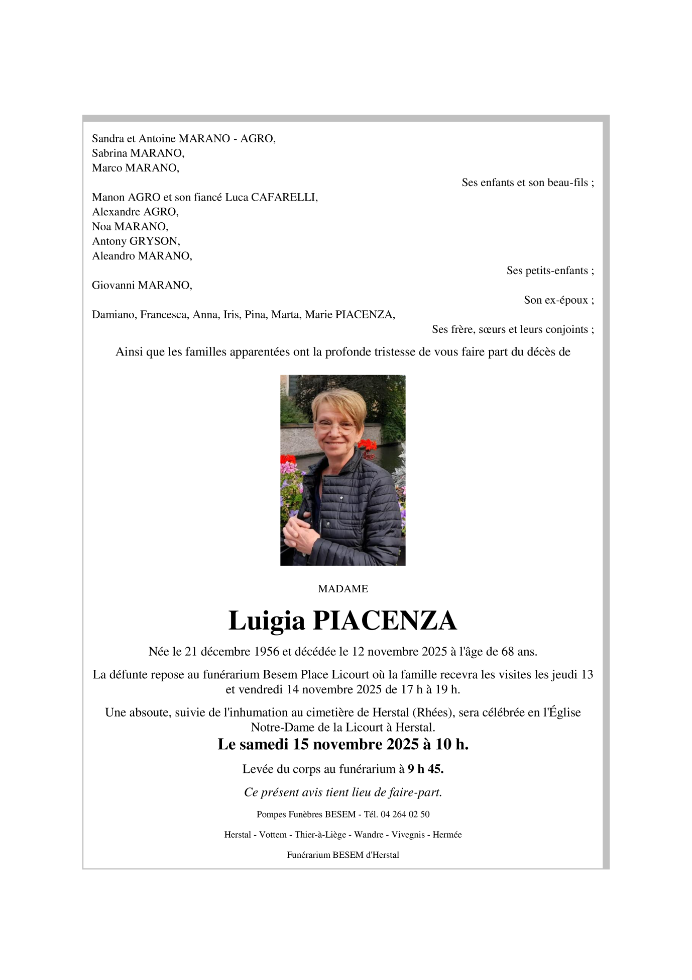 Décédée à Liège (4000) le mercredi 12 novembre 2025 à l'âge de 68 ans