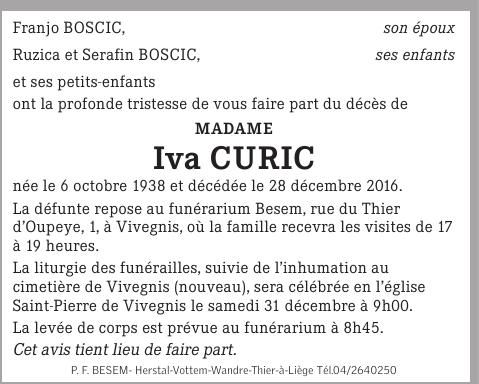 Décédée à Liège (4000) le mercredi 28 décembre 2016 à l'âge de 78 ans