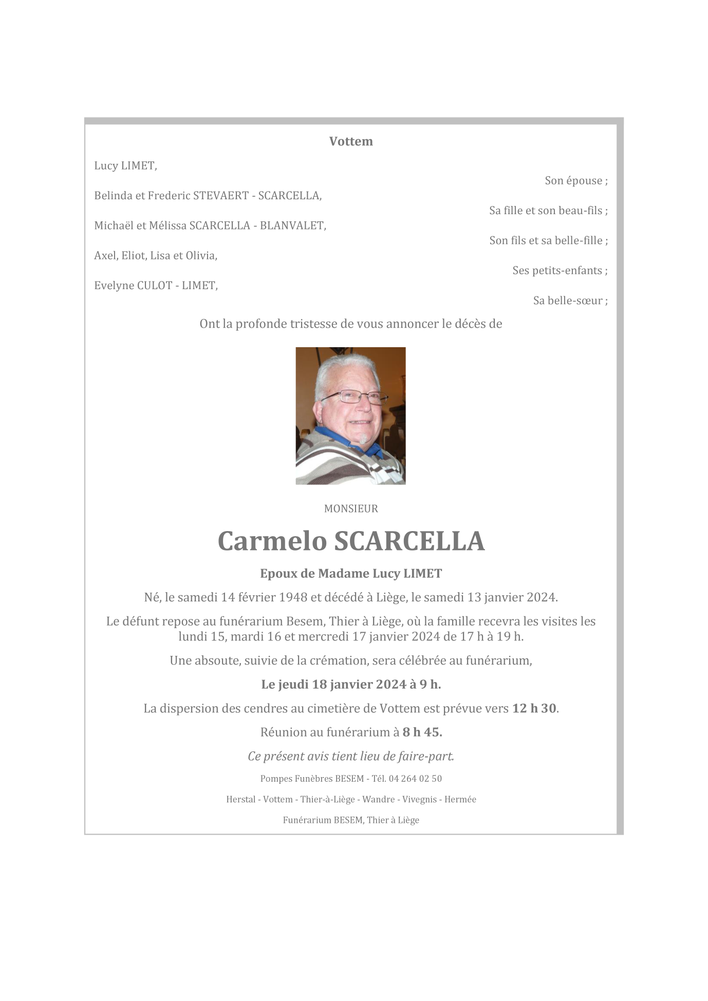 Décédé à Liège (4000) le samedi 13 janvier 2024 à l'âge de 75 ans