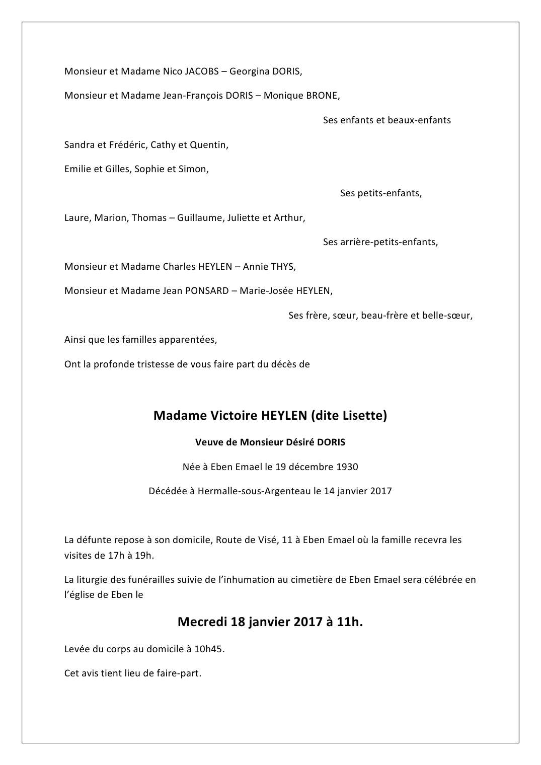 Décédée à Hermalle-sous-Argenteau (4681) le samedi 14 janvier 2017 à l'âge de 86 ans