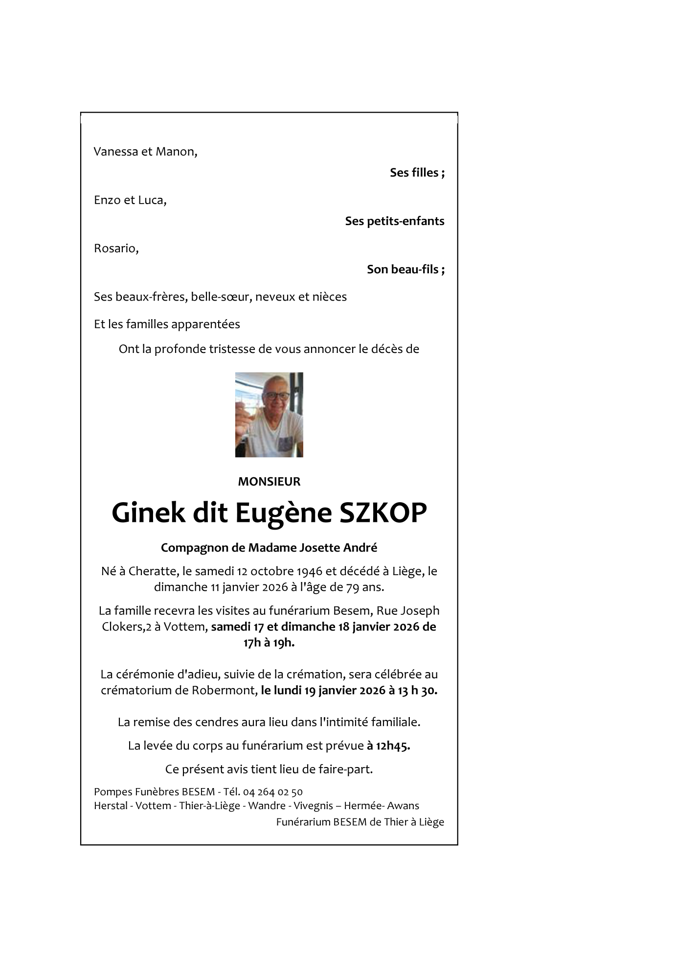 Décédé à Liège (4000) le dimanche 11 janvier 2026 à l'âge de 79 ans