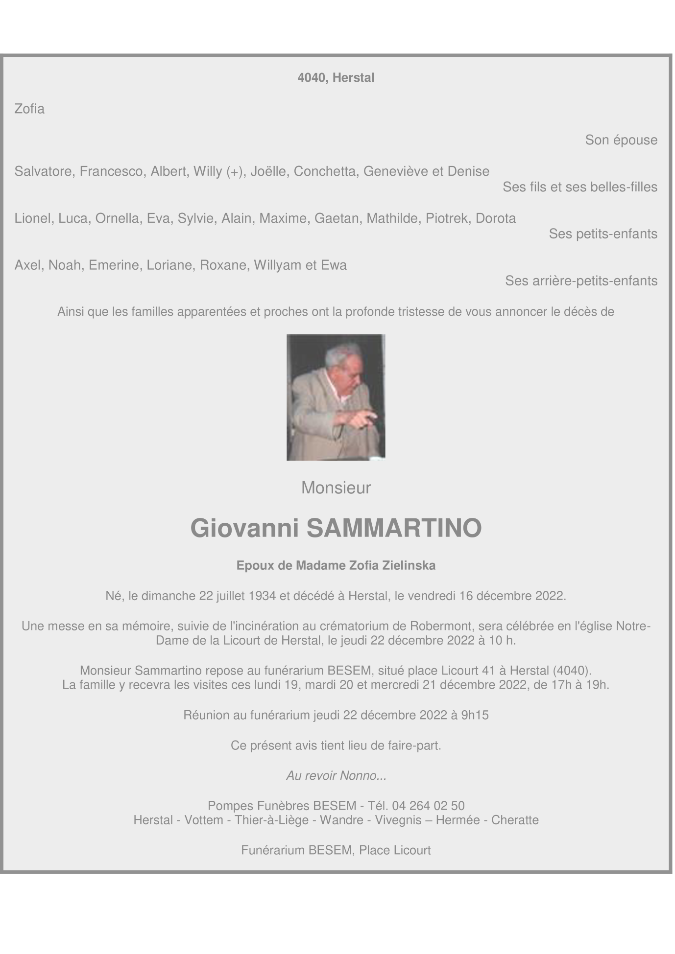 Décédé à Herstal (4040) le vendredi 16 décembre 2022 à l'âge de 88 ans