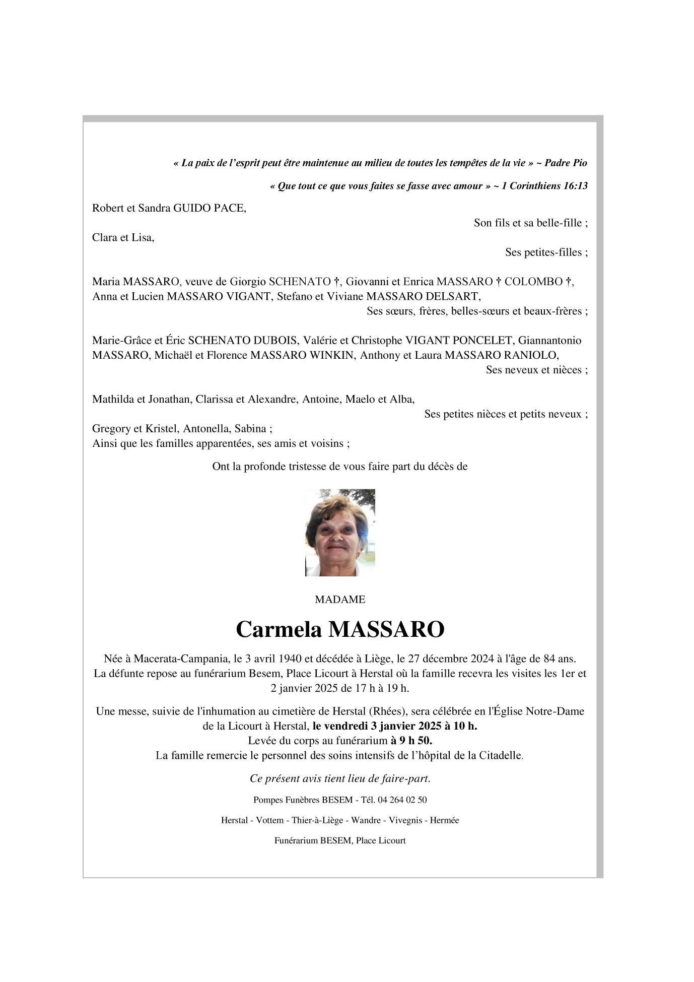 Décédée à Liège (4000) le vendredi 27 décembre 2024 à l'âge de 84 ans