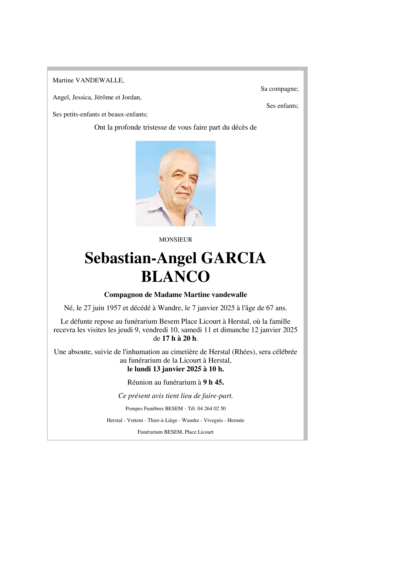 Décédé à Wandre (4020) le mardi 7 janvier 2025 à l'âge de 67 ans