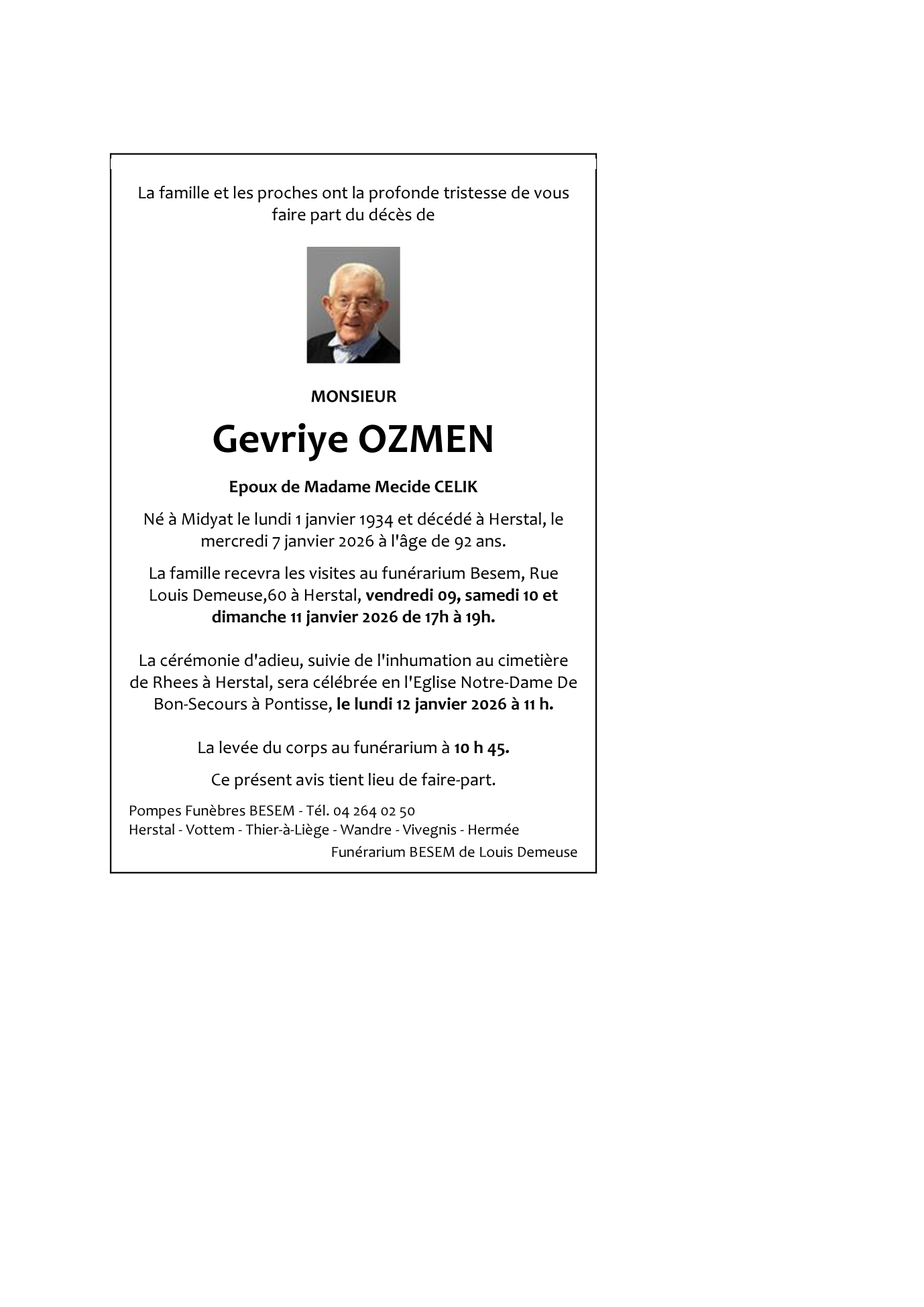 Décédé à Herstal (4040) le mercredi 7 janvier 2026 à l'âge de 92 ans