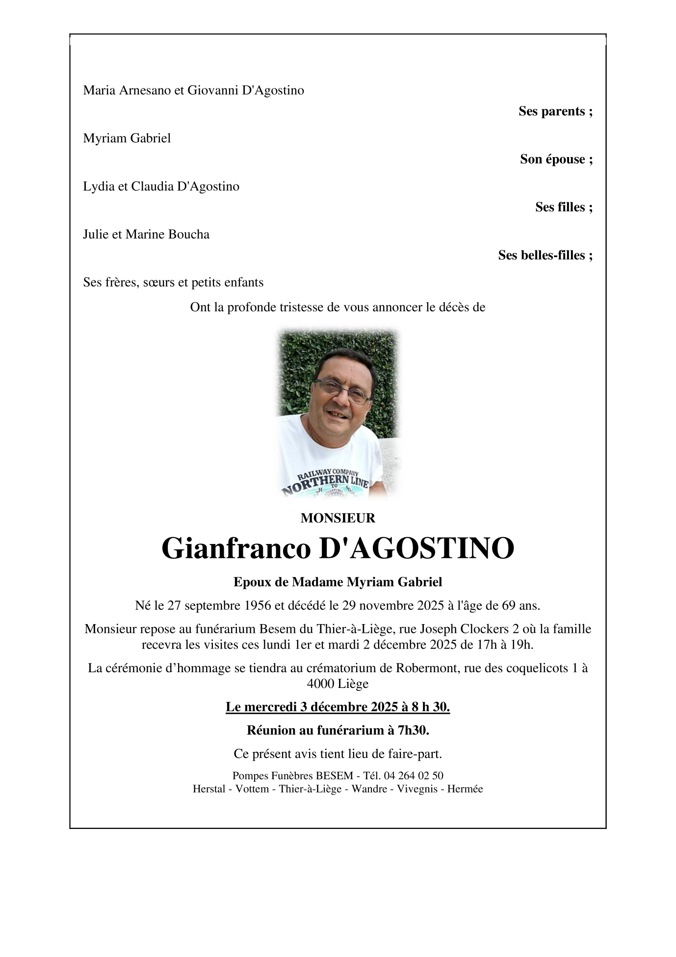 Décédé à Herstal (4040) le samedi 29 novembre 2025 à l'âge de 69 ans
