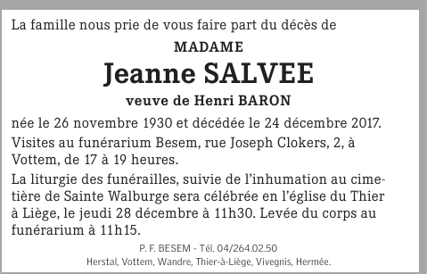Décédée à Milmort (4041) le dimanche 24 décembre 2017 à l'âge de 87 ans